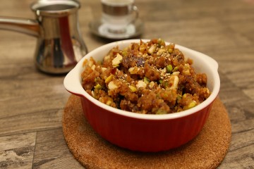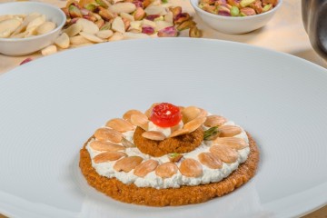 - اسكبي مكونات القشد في طبق التقديم، وأضيفي طبقة من القشطة الطازجة، ثم زيني بالفستق الحلبي، ثم أضيفي القليل من الكريمة بالقهوة العربية على الوجه وقدمي الحلى.