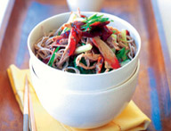 3. افصلي لحم البط عن العظم وقطعيه صغيرا، ضعي النودلز في طبق التقديم ثم أضيفي البط مع الخيار والبصل وانثري الكمية المتبقية من الصوص.