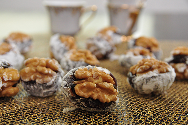 * يمكن وضع نصف حبة من الجوز على جوانب حبة التمر.