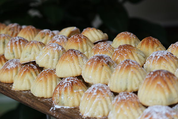6. يقطع العجين إلى كرات بحسب حجم قالب المعمول، تجوف الكرات وتحشى بالفستق وتغلق ثم تكبس بالقالب لتأخذ شكل القالب، تخرج من القالب وتصف بصينية مدهونة بالسمنة.