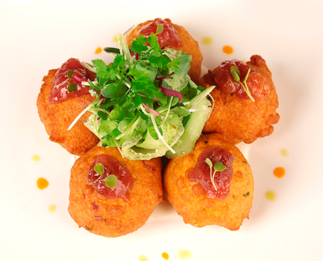2. تناولي بملعقة كبيرة قدراً من المزيج، وفيه مكعب بطاطا واحد، وحمّريه في زيت مغلي، ثم كرري العملية، وضعي المكورات في طبق التقديم، إلى جانب زهرة القرنبيط وقطع البقدونس.