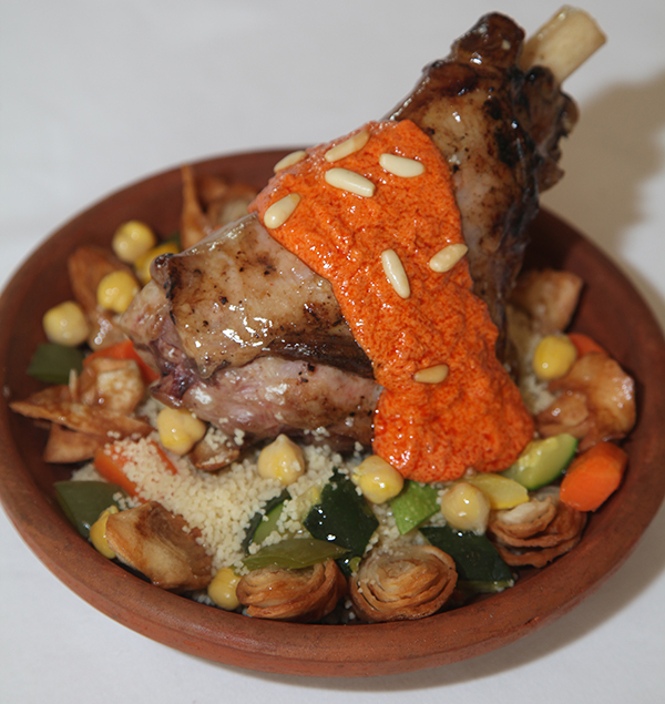 1. اسلقي موزات الغنم والخضار حتى الاستواء، وانقعي الكسكس في ماء موزات الغنم لمدة ربع ساعة، ثم ضعي الخبز وفوقه الكسكس والخضار المسلوقة والحمص المسلوق.