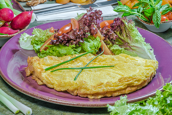 3. طريقة التقديم: ضعي "الأومليت" في طبق التقديم، قدّميه ساخناً، مع سلطة الخس والبندورة الكرزية المقطعة، بتتبيلة عصير الليمون الحامض وزيت الزيتون.