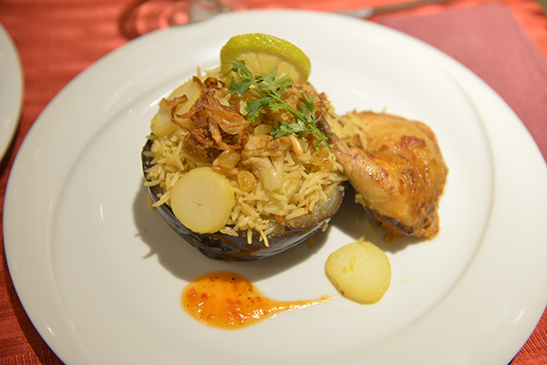 6. زيني المقلوبة، بشرائح البصل والصنوبر والكوسا المقلية والزبيب، بالإضافة إلى أوراق البقدونس والشبت.