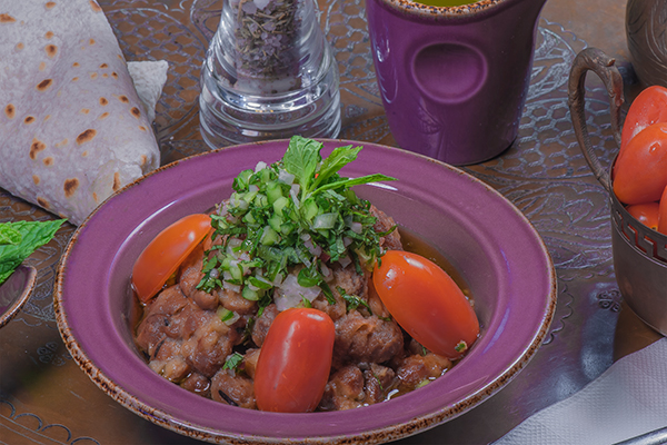 3. طريقة التقديم: ضعي الفول في طبق التقديم. افرمي الخضراوات فرماً ناعماً، واخلطيها سوياً، من ثم وزعيها وسط طبق الفول. اسكبي زيت الزيتون، وقدّمي هذا الطبق ساخناً، مع الخبز العربي.