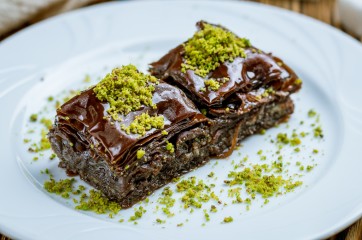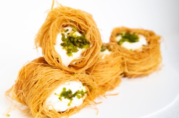- أخرجي الصينية من الفرن واتركيها جانباً حتى تبرد، ثم اسكبي القطر الساخن، ثم زينيها بالفستق الحلبي وقدميها.