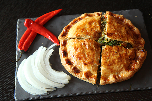 1. اخلطي الدقيق والبيكينج بودر والملح في وعاء متوسط الحجم، ثم أضيفي السمن إلى الدقيق واخفقي بالخلاط، أضيفي إليه صفار البيضة والخل والماء الساخن مع الخفق بالشوكة، ثم غطي العجين، واتركيه لمدة ساعتين ليتخمر.