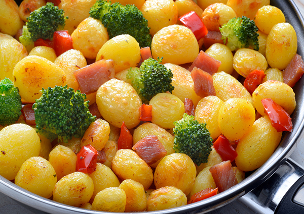 1. ضعي البطاطا المسلوقة والبروكلي والفطر في مقلاة على النار مع القليل من الزيت وشويحيها لمدة 10 دقائق.