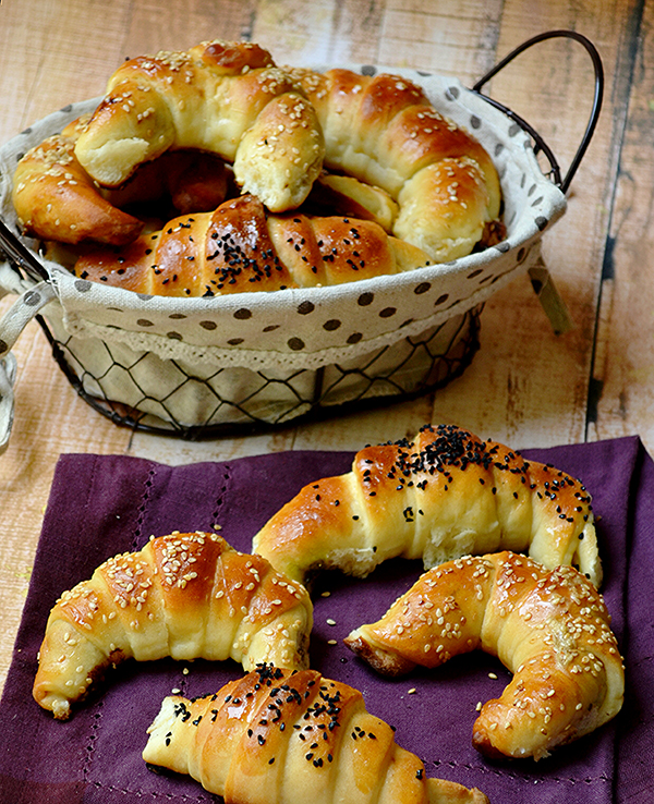 6. حين الانتهاء من حشو العجين نبدأ بدهن وجهه العجين بفرشاة الطبخ بخليط بيضة مخفوقة مع فانيلا وربع ملعقة نسكافيه. ويزين بالسمسم أو حبة البركة ويوضع على صينية بها ورق زبدة ويدخل الفرن في درجة حرارة عالية وعند نضجه يرفع للتحمير قليلا .. ويقدم مع الشاي الساخن.