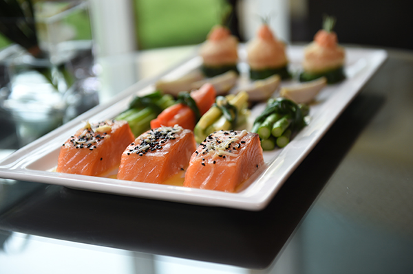 7. في طبق التقديم، لفي السبانخ المسلوقة على شكل كرات، وضعي حبات الروبيان المسلوقة فوقها، من ثم رتبي الكوسا والكرفس والجزر والهليون وقطع السلمون بجانبها.