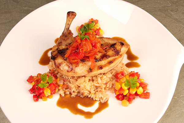 3. ضعي صدور الدجاج بعد تسويتها فوق الأرز، ورشي عليه حبات الفلفل الملونة بعد تحميرها، وأضيفي البصل والذرة وصوص الفراخ الساخن.