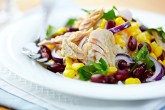- قطعي الفلفل الأخضر، والبصل، والطماطم إلى قطع صغيرة، ثم ضعي الخضار في طبق بايركس، وأضيفي الفاصولياء والذرة، وامزجي المكونات معاً أو اتركيها على شكل طبقات.