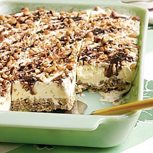 6. أضيفي ملعقة صغيرة من الخليط فوق الشوكولاتة وضعي الصينية في الثلاجة لمدة ليلة كاملة، انثري اللوز المحمص ثم قطعيها وقدميها.
