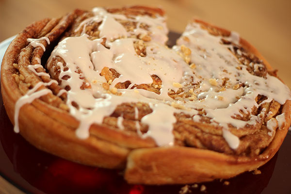 5. أحضري صينية واسعة، خذي شريط من العجينة وابدأي بلفه بشكل أسطواني. ضعيه في الصينية ثم لفي حولها شريط اخر، كرري ذلك لتحصلي على شكل سينابون كبير الحجم.