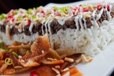 - وزعي اللحم الضاني المسلوق على وجه الطبق وزيني بصوص الطماطم، واللوز المحمص، والبقدونس المفروم، وقدميها.