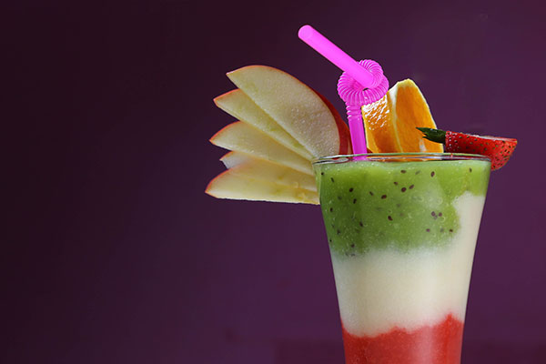 3. وزعي العصائر على الكوبين، وفق الترتيب الآتي: المانغو، فالفراولة، فالجوافة، وأخيراً الكيوي.
