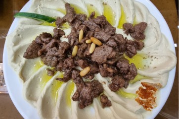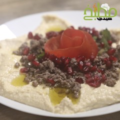 - ضعي الحمص في طبق تقديم واسع، ووزعي فوقه اللحم، وزينيه بالبقدونس المفروم، والصنوبر المحمص، وقدميه.