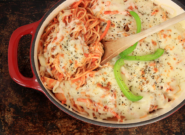 4. يوضع نصف خليط السباغيتي في طبق خبيز مدهون بسمن أو زيت. ومن ثم يوضع فوقه نصف كمية الجبن وصلصة اللحم وجبن الموزاريلا. ويكرر وضعها في طبقات.