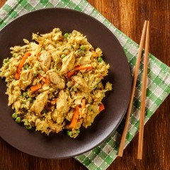 - أضيفي الدجاج، والفليفلة، والفطر، والبصل الأخضر، والجزر، والزنجبيل ثم قلبي المكونات جيداً حتى تذبل.