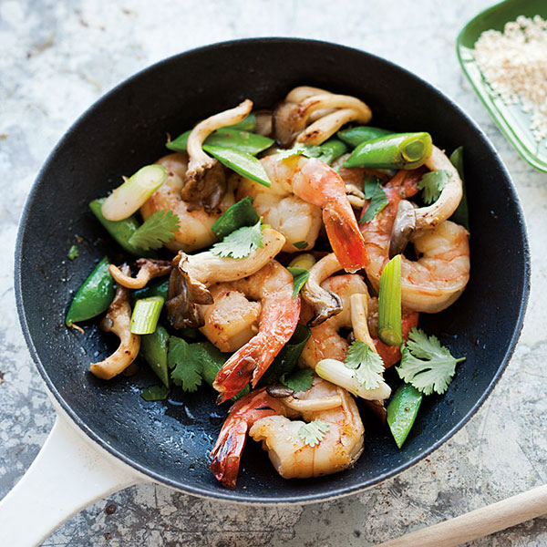 2. يسخن الزيت في مقلاة غير لاصقة كبيرة على نار متوسطة إلى عالية . يقلب الفطر، حتى يتبخر السائل أو يحمر الفطر من 6-10 دقائق. تتم إضافة البازلاء. تقلب حتى تصبح طرية حوالي دقيقتين. ثم يضاف الجمبري ويقلب حتي يصبح وردي اللون، من 3 إلى 5 دقائق. ثم تتم إضافة البصل الأخضر ويقلب 30 ثانية. يحرك الخليط ويصب في مقلاة. يقلب على النار حتى تصبح الصلصة سميكة قليلاً، لحوالي دقيقة. يتبل بالملح والفلفل ويقدم مع الأرز أو النودلز لمن يرغب.