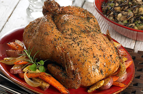 5. ترفع درجة حرارة الفرن إلى 450 درجة (دون إزالة الدجاج من الفرن)؛ ويشوى لمدة 12 دقيقة إضافية أو حتى يسجل مقياس حرارة مدخل في الجزء الطري من الفخذ 165 درجة. تمت إزالة الدجاج من الصينية ويترك ليرتاح 15 دقيقة. بعدها تتم إزالة الجلد من على الدجاج والتخلص منه.
