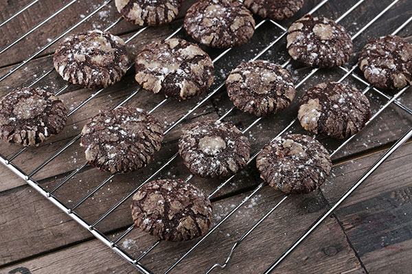 3. تُضاف المكونات الجافة مع التقليب على سرعة هادئة ثم تترك عجينة الكوكيز في الفريزر لمدة ساعة. ثم تشكل على هيئة كرات صغيرة، وتقلب في السكر البودرة، وترص على ورق خاص بالخبز.