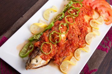 - تبّلي السمك بالملح، ثم ضعيه في الصينية فوق الطماطم المشوية.