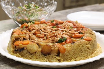 - إقلبي مقلوبة اللحم بالبطاطس والباذنجان في طبق التقديم، وزينيها بالصنوبر المحمّص، ثم قدميها ساخنة.