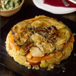 - إقلبي مقلوبة اللحم بالبطاطس والباذنجان في طبق التقديم، وزينيها بالصنوبر المحمّص، ثم قدميها ساخنة.