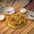 - اقلبي المقلوبة على طبق مسطح خاص بالتقديم، ثم ارفعي الوعاء بهدوء وزيني بالمكسرات.