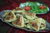 - افردي العجينة إلى دائرة بحجم 5 بوصات. وضعي حوالي ملعقتين كبيرتين من الحشوة في المنتصف. ثم اجمعي الجانبين معاً واضغطيهما لإغلاقهما، وارفعي الجانب الثالث للأعلى بحيث يبدو مثل المثلث واضغطيه ليغلق جيداً، ثم ضعي كل فطيرة على ورقة الخبز.