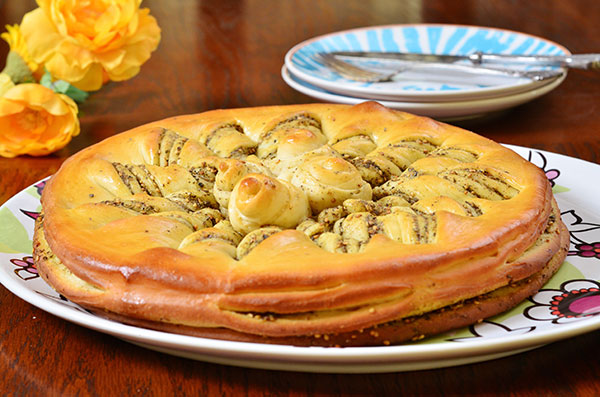 8. اتركي الفطيرة لبضع دقائق، وذلك حتى يتضاعف حجمها، ثم اطليها بخليط التلميع.