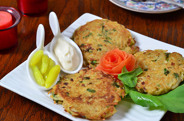 5. خذي القليل من خليط البطاطس، وشكليه بين كفيك على هيئة قرص، ثم ضعيه في المقلاة وانتظري لبضع دقائق، ثم اقلبيه على الجانب الآخر، وانتظري حتى يصبح ذهبيّ اللون، ثم قدميه.
