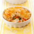6. ضعي العجين داخل طاسة، وأضيفي داخلها حشو الدجاج والبيض، ثم أغلقي العجينة من الجوانب، وألصقيها بالزبدة المذابة، واقلبي البسطيلة لتصبح كالصرر المستديرة، وادهني الجزء العلوي بالزبدة المذابة.