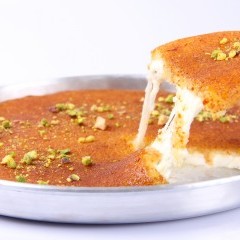 - وزعي الشيرة على الكنافة وهي ساخنة، ثم قطعيها وقدميها ساخنة.