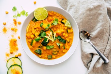 - أضيفي الطماطم المفرومة، ومرق الخضار، والزهرة، والبطاطس الحلوة المسلوقة، والحمّص.
