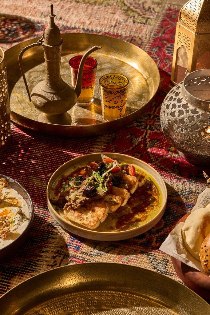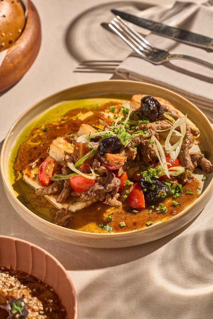 - ضعي جبنة الحلوم في طبق، وفوقها قطع اللحمة المسلوقة أو المشوية، وحبات الطماطم المشوية، والبقدونس، والثوم المعمّر.