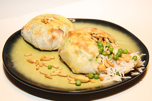 3. تحشى كل قطعة من العجينة بخليط الأرز والبازيلاء وتغلق بشكل دائري وتلصق بواسطة البيض.