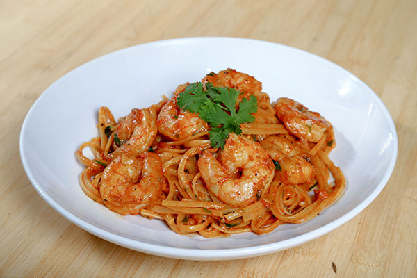 1. اغلي الماء في قدر، واسلقي الباستا، حسب المدّة المدوّنة على العبوة. وفي أثناء سلق الباستا، اغسلي الروبيان، وقومي بتصفيته.