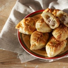 - إفردي العجينة على سطح صلب مرشوش بالطحين، ثم قطّعيها إلى مربعات متساوية، واحشيها بحشوة اللحم، ثم أغلقي الأطراف باستخدام شوكة.