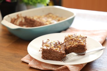 - انثري الكاكاو على وجه الحلى البارد، ثم قطّعيه وقدميه.
