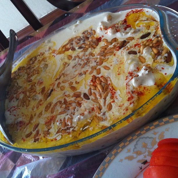 5. وبعد ذلك يضاف خليط الطححينة المعد سابقاً وتضاف المكسرات والبابريكا للزينة ومن ثم يحمى السمن نفسه الذي قلي فيه المكسرات ويوضع مباشرة على الطبق. ملاحظة: بعد وضع السمن على الطبق يأكل مباشرة لا يترك حتى يبرد.