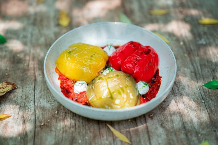 - طريقة التقديم: تُسكب 3 إلى 4 ملاعق كبيرة من صلصة الطماطم في الطبق. تُقطّع كلّ حبة فليفلة إلى نصفين متساويَين. وتوضع على الطبق على أن تكون الجهة المقطوعة منها نحو الأعلى. يُسكب زبادي اللوز بين قطع الفليفلة باستخدام كيس للتزيين، وتوضع أخيراً أوراق الشبت الطازجة على الزبادي.