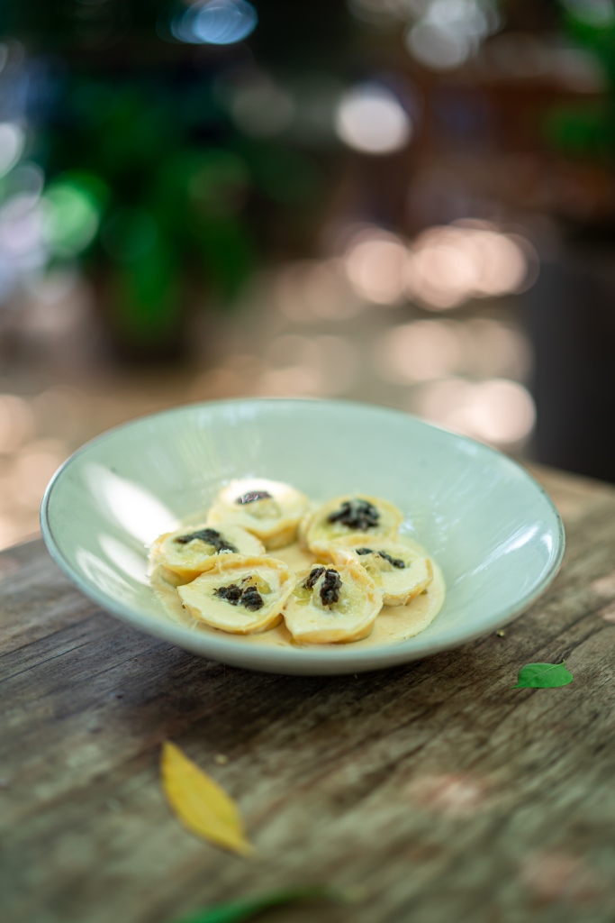 - تُطهى الكريمة على نار خفيفة إلى متوسّطة وتُترك لتغلي. ويضاف إليها زيت الكمأة وتُترك الكريمة جانباً حتّى يحين وقت التقديم.