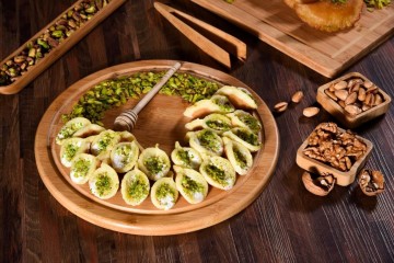 - قدمي القطايف المقلية في طبق التقديم.