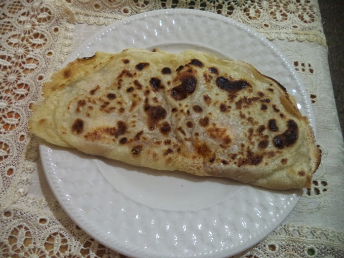3. نتركها تبرد ونأخد مقلاة نسخنها جيدا وندهنها بقليل من الزيت ثم نغرف غرفة من الخليط الأول ونتركها دقيقة ونقلب الوجه ونفرغ الحشوة ملعقة كبيرة ونصف تكفي نسويها على النصف ونغلق الحبة على النصف متل الصورة وتقلب.