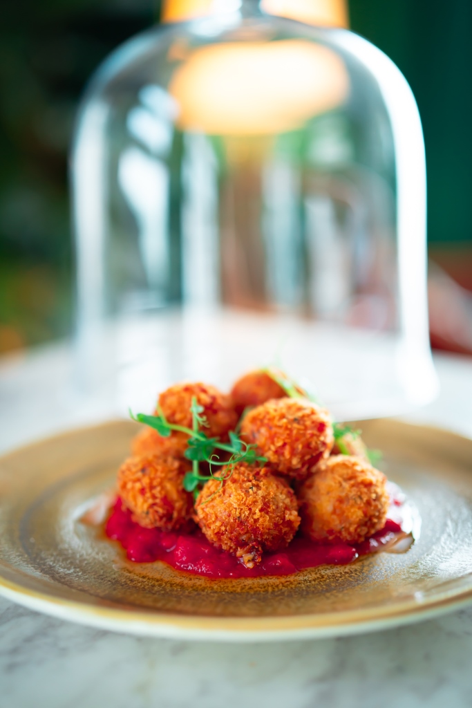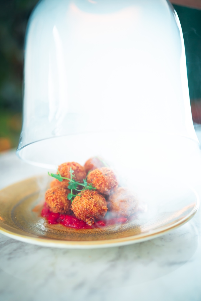 - تصف الكرات في الطبق فوق صلصة الطماطم، ونزين الكبسة بالأعشاب الخضراء.