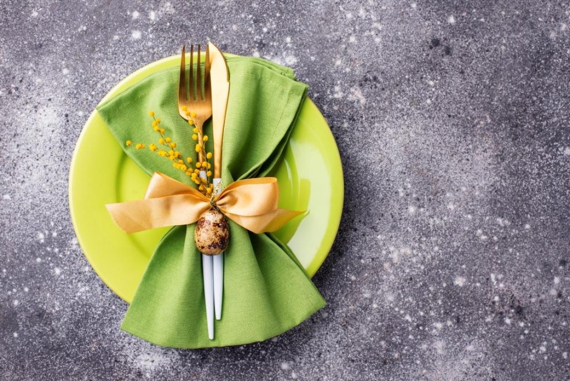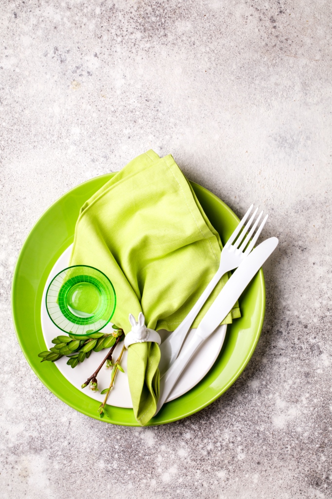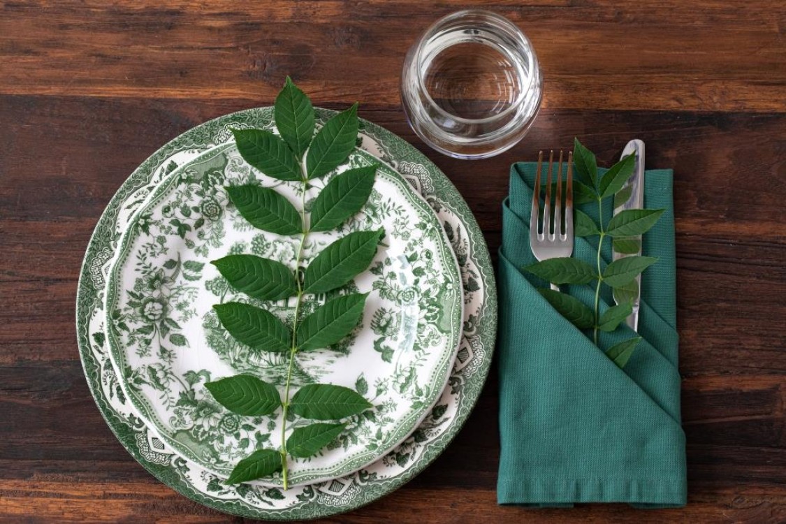 احرصي على التباين بين مفرش المائدة الأبيض والأطباق المطلية بألوان خضراء، علاوة على ذلك، يجب أن تكون الزهور موجودة في بقية الديكور: على المزهريات والمناديل.