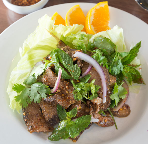 3. في وعاء التقديم اخلطي الخس مع الفلفل وأضيفي الصلصة المحضرة من الزيت ثم اللحم المشوي.