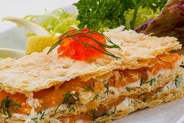 3. إفردي طبقة من العجين، من ثم ضعي فوقها طبقة من خليط الجبن والحليب، وشريحة من السلمون. كرّري هذه العملية حتى تحصلي على 3 طبقات من العجين.